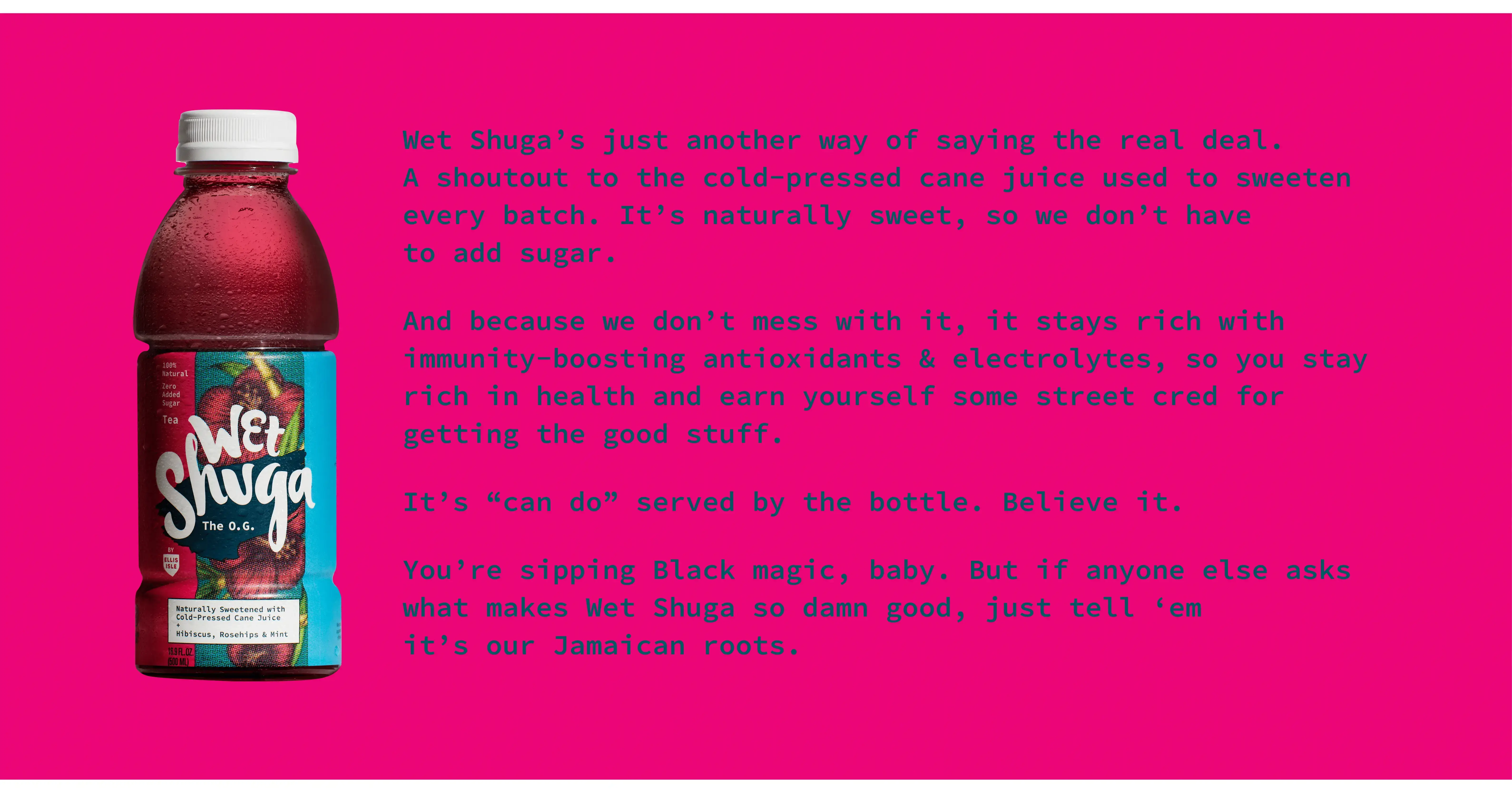 Shuga (note the onomatopoeia) is what Jamaicans call cane juice. The name emphasizes the product’s innovation with a tinge of