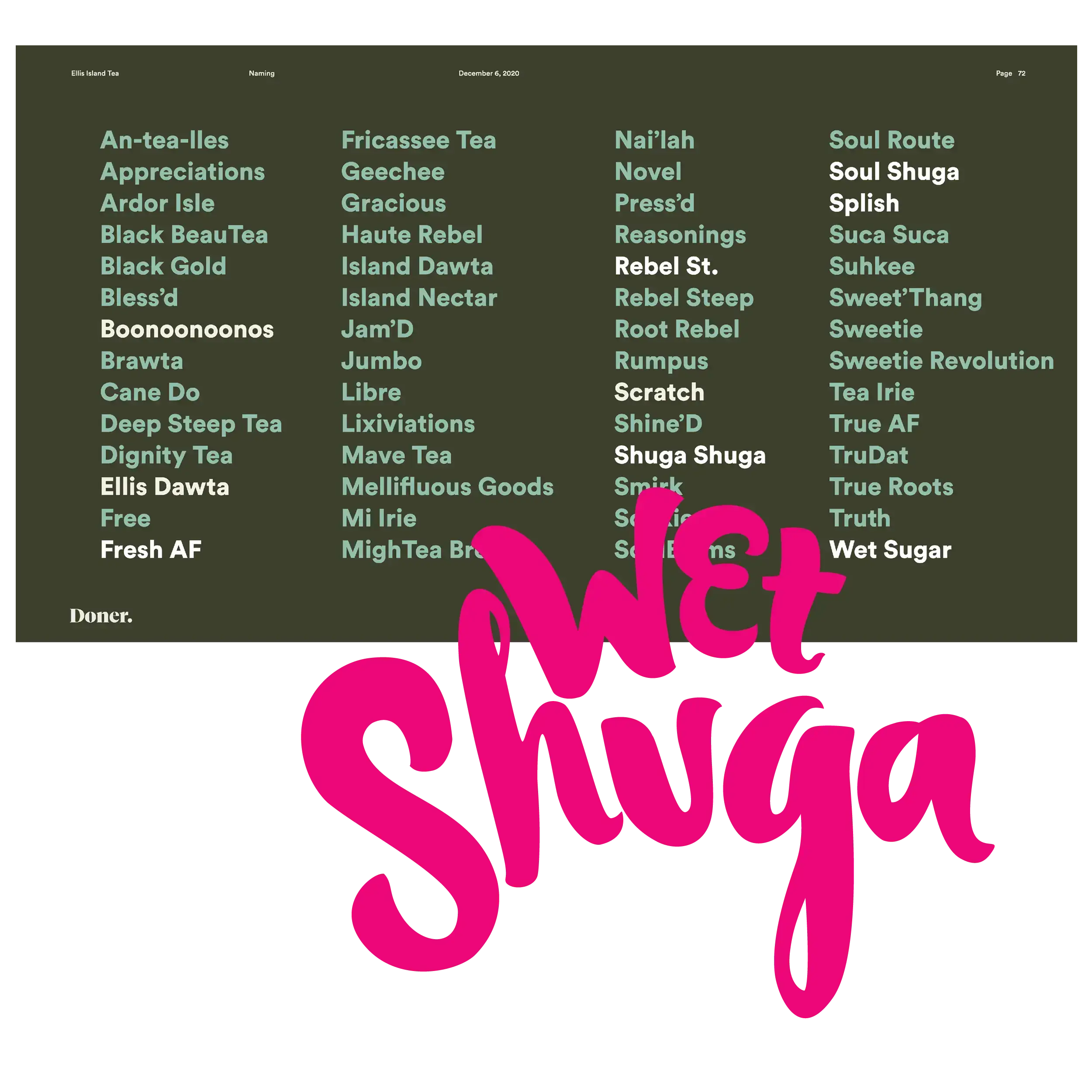 Then, we began the process of naming the new recipe. The BrandWorld not only provided the creative basis for the naming process but also provided many of the stems from which names were generated. Ultimately, the brand’s Caribbean origins won out. Wet Shuga (note the onomatopoeia) is what Jamaicans call cane juice. The name emphasizes the product’s innovation with a tinge of naughtiness.